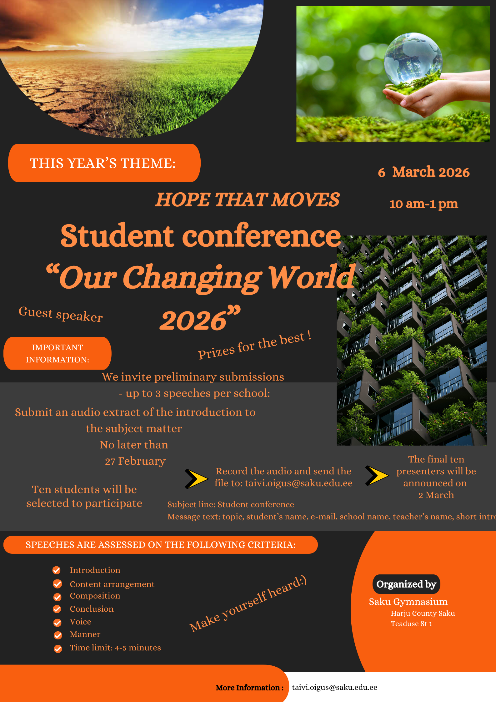 The student conference “OUR CHANGING WORLD 2026” will be held at Saku Gymnasium, Teaduse St 1 on 6 March 2025.